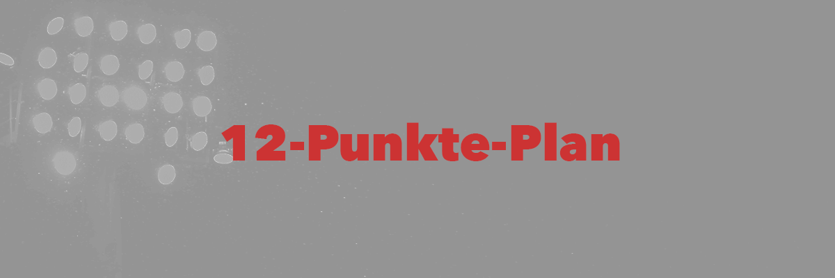 Aus diesen Gründen hat Unsere Kurve einen eigenen 12-Punkte-Plan erstellt. Dieser führt die drängendsten Probleme, denen Fans an jedem Wochenende ausgesetzt sind, ebenso auf wie mögliche Lösungswege zur Verbesserung der beeinträchtigenden Zustände.
